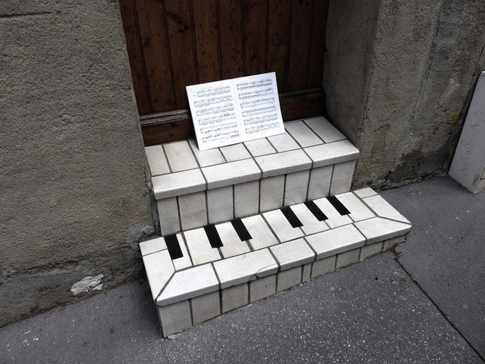 It looks like a few well placed pieces of black tape and a few pages of music charts can turn this ordinary set of steps into a fanciful little bit of art.