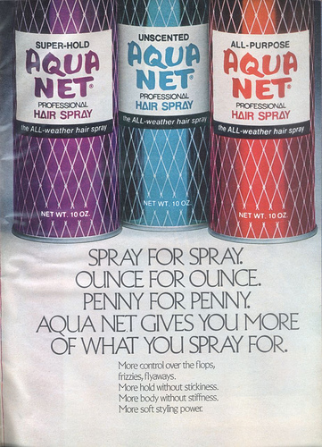 I have strange memories of cloud’s of hairspray wafting out of the bathroom at my Aunt and Uncle’s house, legs crossed, face blue waiting in line for the bathroom. Cans of Aqua Net gleaming in the corner, piled up like old rifle shells. His older sister would be in there for hours putting the finishing touches on her masterpiece mop. Most specifically the largest bangs you ever saw…she would have referred to them as “mall bangs.”